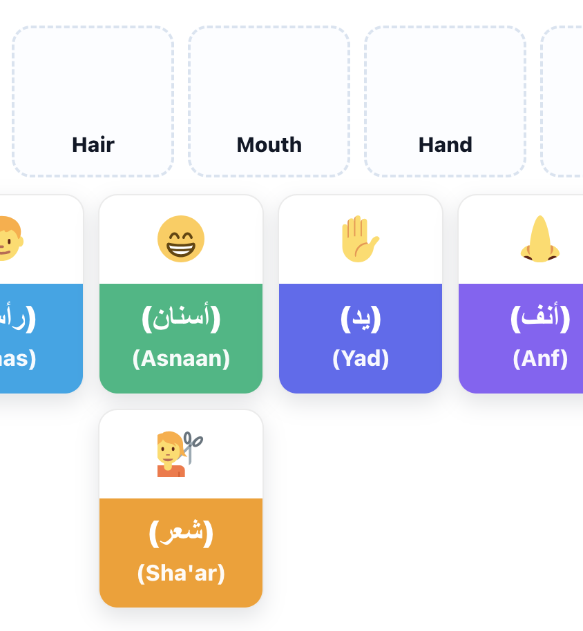 Library (Free Resources) Printables, songs, and stories to help kids ages 2–7 learn spoken Egyptian Arabic (Masri). Buy Flashcards Get the Free Starter Pack Printables Songs Story Time Flashcards Colours in Arabic Arabic Alphabet Body Parts Coloring Game Matching Game